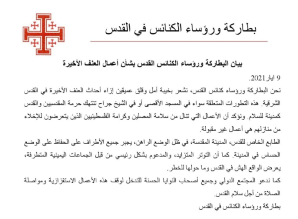 بيان البطاركة ورؤساء الكنائس القدس بشأن أعمال العنف الأخيرة