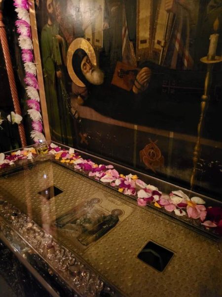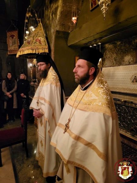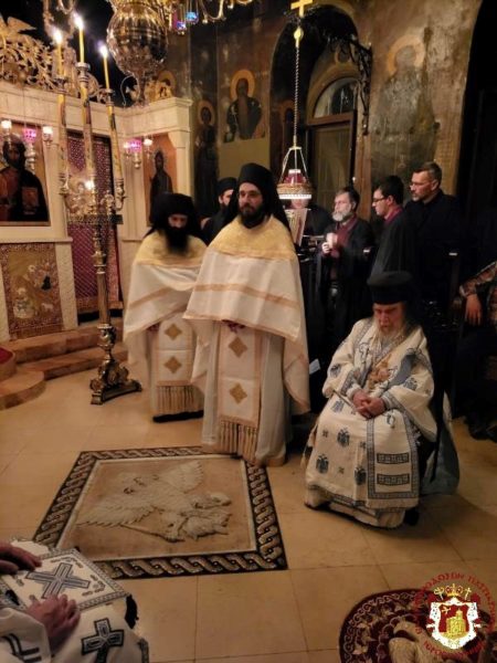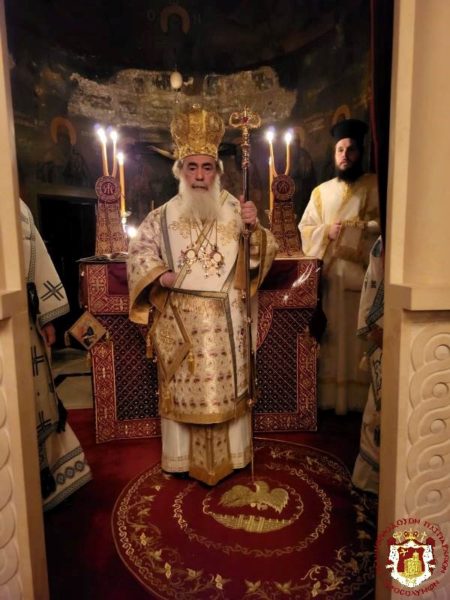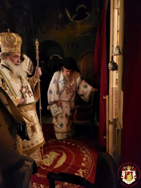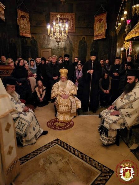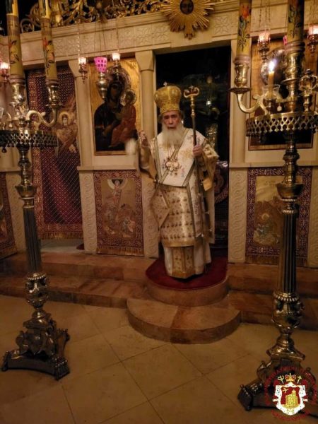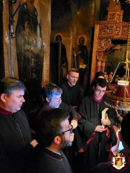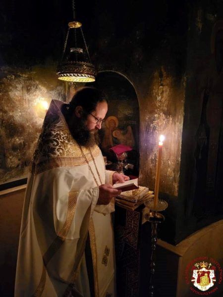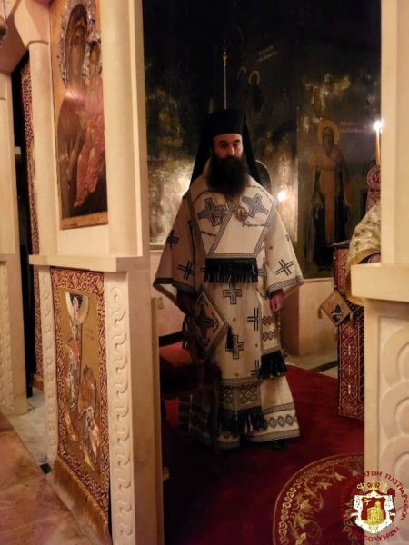 غبطة البطريرك كيريوس كيريوس ثيوفيلوس الثالث ترأس خدمة صلاة الغروب وخدمة القداس الالهي في الدير يشاركه سيادة رئيس أساقفة قسطنطيني كيريوس أريسترخوس, سيادة رئيس أساقفة إيرابوليوس كيريوس إيسيذوروس, رهبان الدير وآباء من أخوية القبر المقدس. وشارك في الترتيل نخبة من المرتلين في كنائس مختفلة في اليونان. وحضر ايضاً عدد من المصلين المحليين وزوار من الخارج.