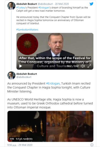 He announced today that the Conquest Chapter from Quran will be recited in Hagia Sophia tomorrow on anniversary of Ottoman conquest of Istanbul. #SymbolismMatters pic.twitter.com/IRSBP7WcSA