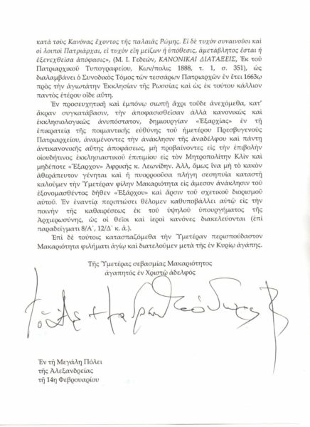 كما كتب البابا وبطريرك الإسكندرية: “ندعو الصديق المبارك صاحب الغبطة إلى استدعاء ما يسمى “إكسارخس” ذي الصلة فورًا”. وإلا فإننا سنخضعه لعقوبة الفصل من الخدمة العليا للكهنوت الأعظم حيث تتقاطع القواعد الإلهية والمقدسة”.