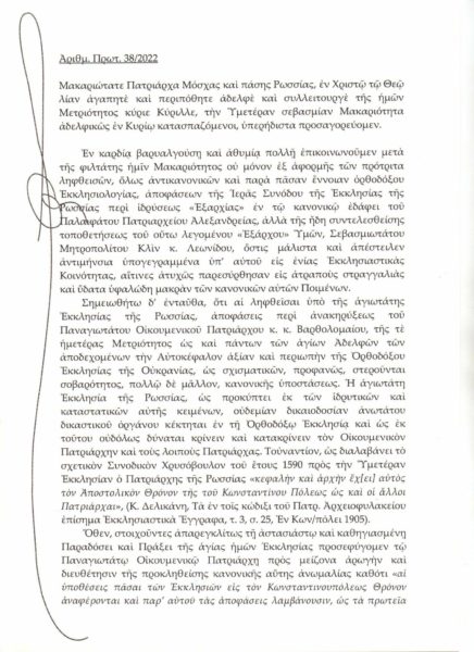 مشيرًا لبطريرك موسكو أن القرارات التي اتخذها السينودس الروسي بشأن مسألة الحكم الذاتي للكنيسة الأوكرانية “تفتقر إلى الجدية”.