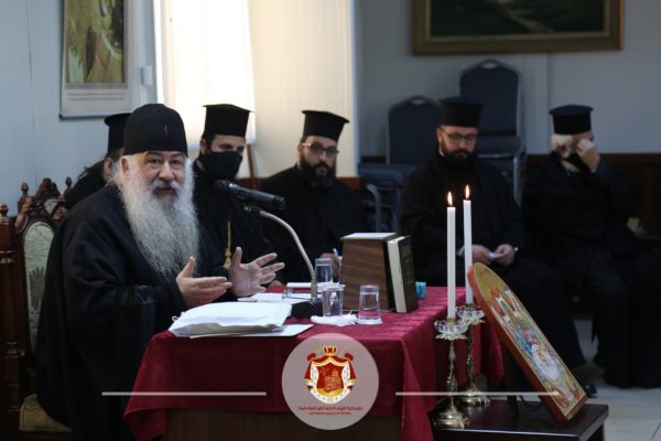 إستهلّ سيادة المطران حديثه بنقل أدعية ومعايدات صاحب الغبطة للآباء بمناسبة الأعياد المجيدة، مشيراً إلى التحديات التي تواجه الكنيسة وتنعكس على أبنائنا في هذه الظروف الراهنة، مؤكداً أن واجب الكنيسة مساندة المؤمنين والوقوف إلى جانبهم لتعزيز حياتهم الروحيّة وعيش اللتورجيا الإلهيَّة وإحياء الصلوات اليومية في البيت العائلي، والتي تثمر حياتنا بالتوبة الحقيقية لنتخطى من خلالها كل العقبات التي تعيق وصولنا إلى الملكوت السماوي . كما حثّ الآباء الكهنة على ضرورة توجيه المؤمنين للتضرع المستمر نحو إلهنا المتحنن لرفع الوباء عن أردننا الحبيب والعالم بأسره.