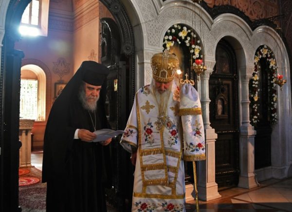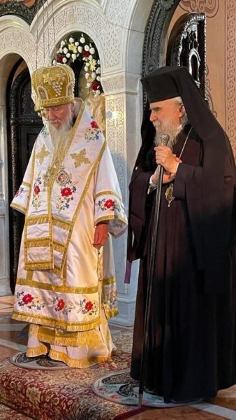 خلال القداس الإلهي حضر للدير سيادة رئيس أساقفة قسطنطيني كيريوس أريسترخوس السكرتير العام للبطريركية يرافقه الشماس الأب سيمون لتقديم التهاني نيابة عن صاحب الغبطة كيريوس كيريوس ثيوفيلوس الثالث المتواجد حالياً في الأردن والقى كلمة غبطة البطريرك: