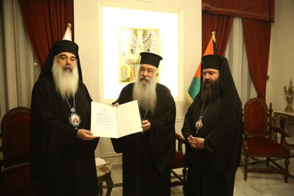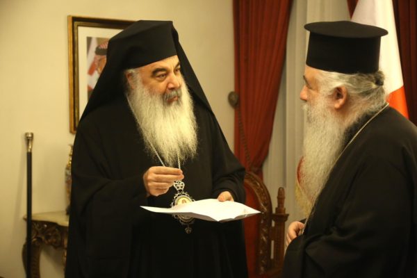 من سُوريا (كنيسة أنطاكية) تَهادى وفد بَطريركي رَفيع الى العاصِمة الأردنية عمّان تَمثل بصاحب السّيادة المِتروبوليت أثناسيوس فهد متروبوليت اللاذقية وصَاحب السّيادة المُتروبوليت أفرام مَعلولي ميتروبوليت حَلب الجزيليّ الإحترام، حَاملين لكنيسة القُدس رِسالة المَحبة الأخوية وعَودة الشّركة الكنسيّة ما بَين بطريركية أنطاكية وسائِر المَشرق للرّوم الأرثوذكس وبَطريركية الرّوم الأرثوذكس المَقدِسية.