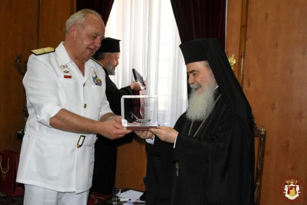 في نهاية الزيارة قدم قائد البحرية اليونانية لصاحب الغبطة شعار النبالة ونموذج السفينة الثلاثية ، بينما قدم له الأخير أيقونة فضية للمدينة المقدسة أورشليم.