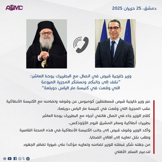 وزير خارجية قبرص في اتصال مع البطريرك يوحنا العاشر: “نقف إلى جانبكم ونستنكر المجزرة المروعة التي وقعت في كنيسة مار الياس دويلعة”