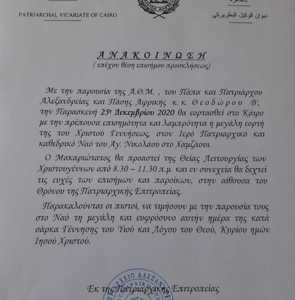 მისი ღვთაებრივი უნეტარესობა პაპი და პატრიარქი ალექსანდრიისა და სრულიად აფრიკისა თეოდორე მეორე, 2020 წლის 25 დეკემბერს საშობაო სადღესასწაულო ღვთისმსახურებას კაიროს წმიდა ნიკოლოზის სახელობის საპატრიარქო ტაძარში აღასრულებს.
