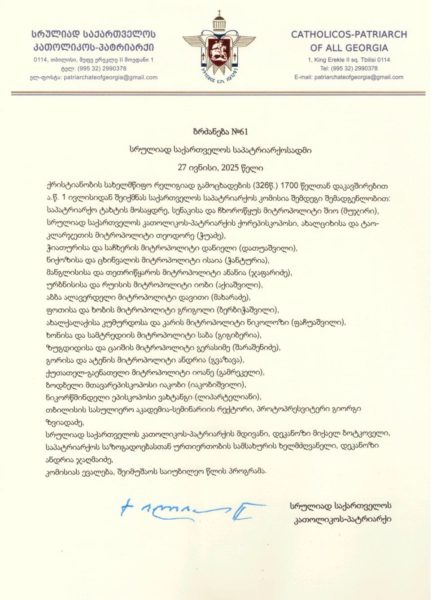ბრძანება #61 სრულიად საქართველოს საპატრიარქოსადმი