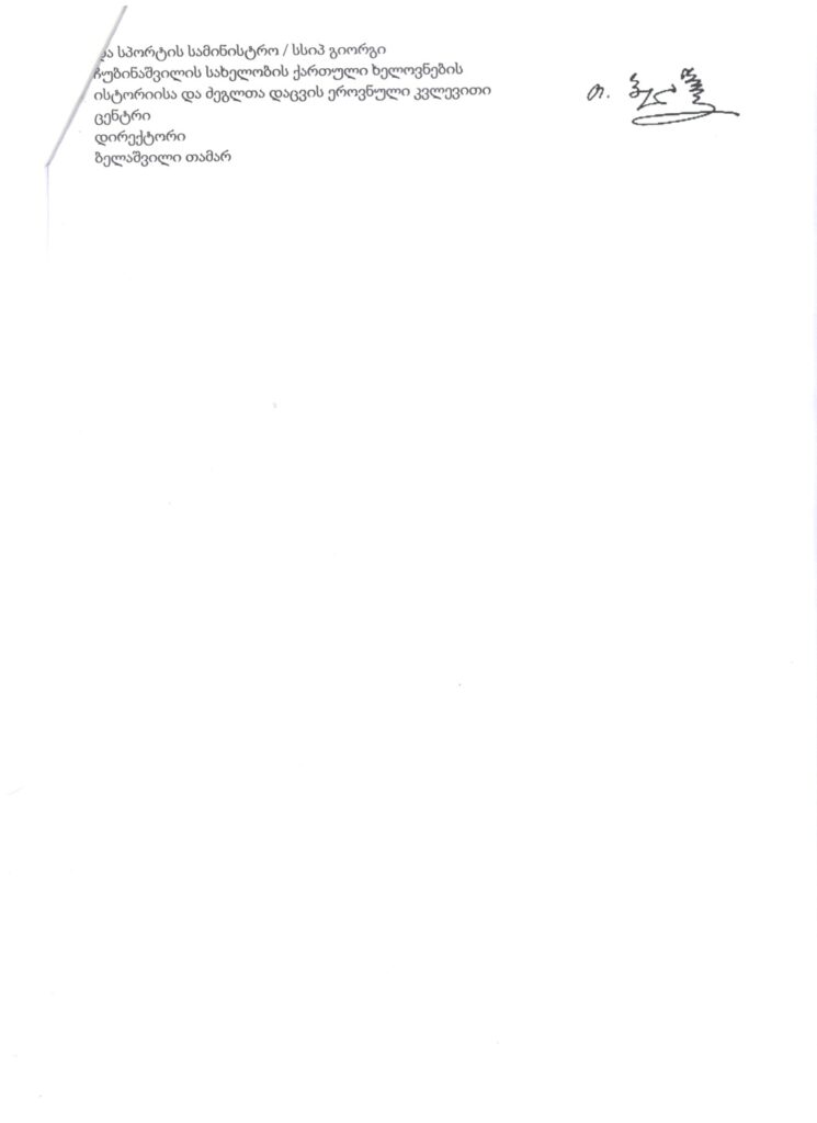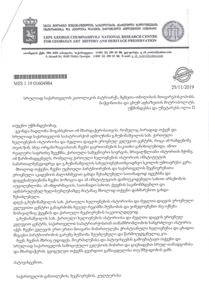 გიორგი ჩუბინაშვილის სახ. ქართული ხელოვნებისა და ძეგლთა დაცვის ეროვნული კვლევითი ცენტრის წერილი სრულიად საქართველოს კათოლიკოს-პატრიარქს