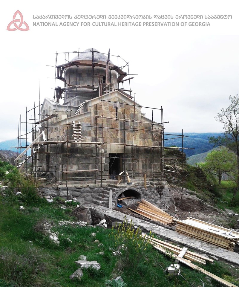 „ამავე ქვით მოპირკეთდა გუმბათის ყელი და ეკლესიის კარნიზები. გადახურვის კონსტრუქციაზე მოჭიმული კირხსნარის პოლიმერული იზოლაციის ფენაზე ქვედა დონის სახურავები შეიმოსა ხის ფენილით, სადაც უახლოეს მომავალში ავთენტური ფორმის კრამიტის მოწყობის პროცესი დაიწყება. ქართული აგურით აღდგა ეკლესიის კანკელი, რომელიც კირხსნარით შეილესა“, – აცხადებენ სააგენტოში.