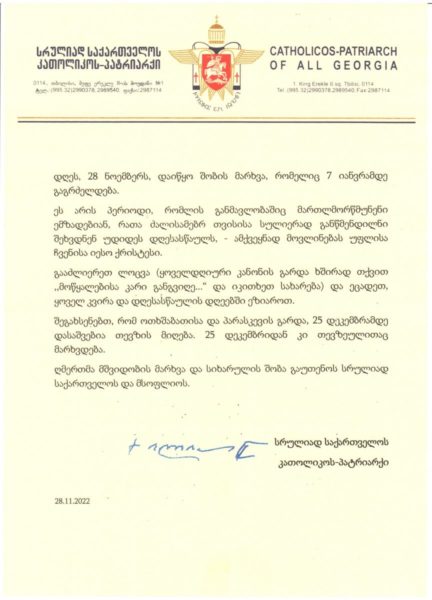 ღმერთმა მშვიდობის მარხვა და სიხარულის შობა გაუთენოს სრულიად საქართველოს და მსოფლიოს.