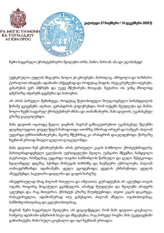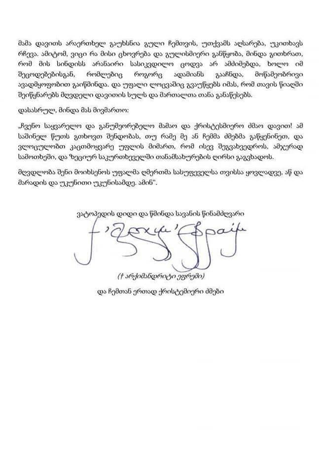 ვატოპედის მონასტრის წინამძღვრის წერილი მამა დავით ქვლივიძის ოჯახს
