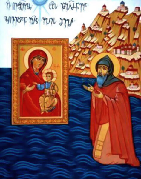 იმხანად ივერთა სავანის მიდამოებში, მიუვალ მთაზე, განმარტოებულ სენაკში კაცთა მზერას მოშორებულ ღმრთის სათნო ღვაწლში ატარებდა განდეგილ ცხოვრებას ღირსი გაბრიელი, ტომით ქართველი. ზეციური ნათლით შემოსილი ღმრთისმშობელი ძილში გამოეცხადა ღირს გაბრიელს, რომელიც თავისი სენაკის სიმაღლიდან ჭვრეტდა ზღვით მობრძანებულ პატიოსან ხატს ღმრთის დედისა, და უთხრა: „აუწყე წინამძღვარსა და ძმებს, რომ მნებავს, მივანიჭო მათ ჩემი ხატი შემწედ და მფარველად. ნიშნად ამისა შემოდი ზღვაში, რწმენით გაიარე მის ტალღებზე და მაშინ ყველა შეიტყობს თქვენი სავანისადმი ჩემს სიყვარულსა და წყალობას“.