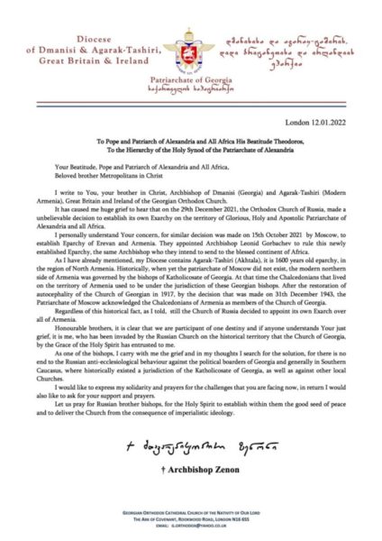 საქართველოს სამოციქულო მართლმადიდებელი ეკლესიის წმიდა სინოდის წევრმა, მაღალყოვლადუსამღვდელოესმა დმანისისა და ლორე-ტაშირის და დიდი ბრიტანეთისა და ირლანდიის მთავარეპისკოპოსმა ზენონმა ოფიციალური წერილი გაუგზავნა უნეტარეს ალექსანდრიისა და სრულიად აფრიკის პაპსა და პატრიარქს თეოდორე მეორესა და ალექსანდრიის სამოციქულო მართლმადიდებელი ეკლესიის წმიდა სინოდს.
