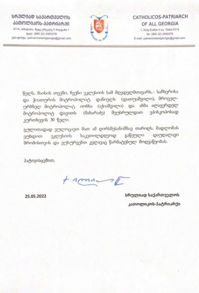 წელს, მაისის თვეში, ჩვენი ეკლესიის სამ მღვდელმთავარს, – საჩხერისა და ჭიათურის მიტროპოლიტ დანიელს (დათუაშვილი), მროველ-ურბნელ მიტროპოლიტ იობს (აქიაშვილი) და აბბა ალავერდელ მიტროპოლიტ დავითს (მახარაძე) შეუსრულდათ ეპისკოპოსად კურთხევის 30 წელი.