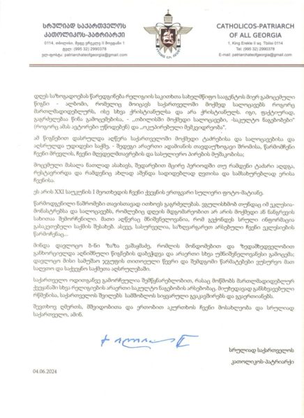 პატრიარქის წერილი წიგნის – ,,საქართველოში მოქმედი საკულტო ნაგებობები” წარდგენისას
