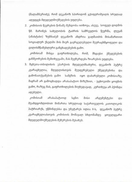 კომისიამ არასაპატიოდ სცნო მისი არგუმენტები და შუამდგომლობით მიმართა სრულიად საქართველოს კათოლიკოს პატრიარქს, უწმინდესსა და უნეტარეს ილია II-ს, დეკანოზ პეტრე კვარაცხელიასთვის კომისიის მომავალ სხდომამდე ყოველგვარი მღვდელმოქმედების შეჩერების შესახებ.