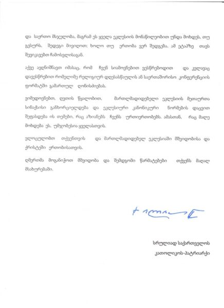 ღმერთმა მოგანიჭოთ მშვიდობა და შემდგომი წარმატებები თქვენს მაღალ მსახურებაში” ,- ნათქვამია წერილში, რომლსაც ხელს საქართველოს პატრიარქი, უწმინდესი და უნეტარესი ილია მეორე აწერს.