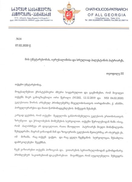 საქართველოს ეკლესიის, იორდანიის შეკრებაში მონაწილეობასთან დაკავსირებით, აქ ვაქვეყნებ წერილს, რომელიც 7 თებერვალს გაეგზავნა იერუსალიმის პატრიარქს