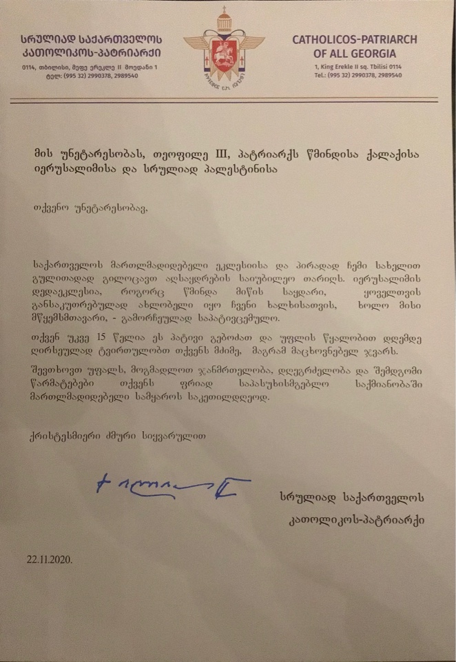 სრულიად საქართველოს კათოლიკოს-პატრიარქის მილოცვა იერუსალიმის პატრიარქს