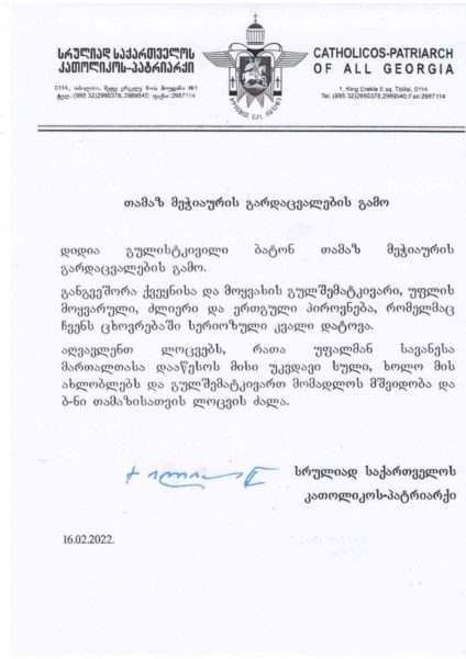 სრულიად საქართველოს კათოლიკოს-პატრიარქის სამძიმარი ბ-ნ თამაზ მეჭიაურის გარდაცვალების გამო