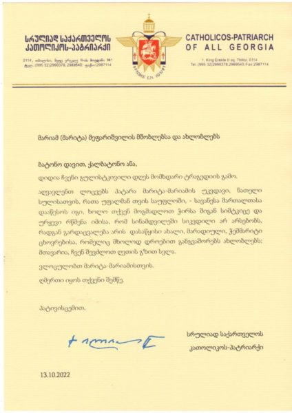 14/10/2022 14/10/2022 მარიამ (მარიტა) მეფარიშვილის მშობლებსა და ახლობლებს   ბატონო დავით, ქალბატონო ანა, დიდია ჩვენი გულისტკივილი დღეს მომხდარი ტრაგედიის გამო. აღვავლენთ ლოცვებს პატარა მარიტა-მარიამის უკვდავი, ნათელი სულისათვის, რათა უფალმან თვის საუფლოში, – სავანესა მართალთასა დააწესოს იგი, ხოლო თქვენ მოგმადლოთ ჭირსა შიგან სიმტკიცე და ურყევი რწმენა იმისა, რომ სინამდვილეში სიკვდილი არ არსებობს, რადგან გარდაცვალება არის დასაწყისი ახალი, მარადიული,...