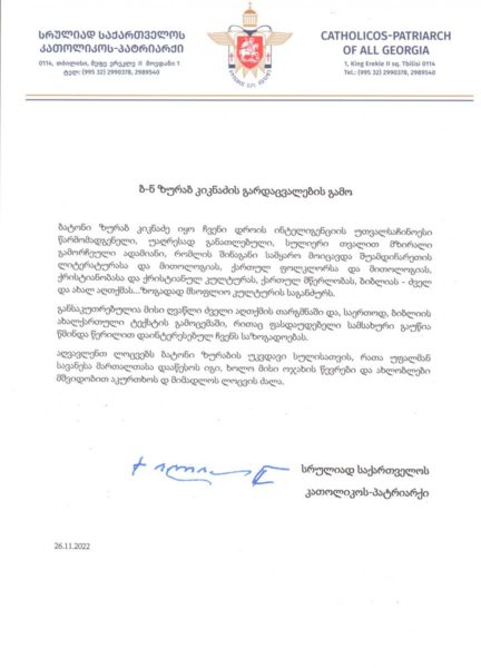 სრულიად საქართველოს კათოლიკოს-პატრიარქის სამძიმარი ზურაბ კიკნაძის გარდაცვალების გამო