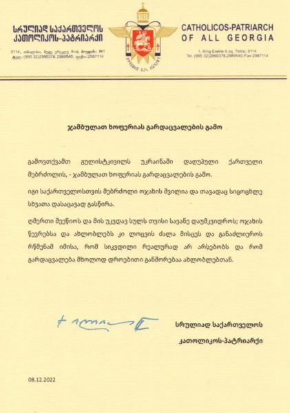 09/12/2022 09/12/2022 ჯამბულათ ხოფერიას გარდაცვალების გამო   გამოვთქვამთ გულისტკივილს უკრაინაში დაღუპული ქართველი მებრძოლის, – ჯამბულათ ხოფერიას გარდაცვალების გამო. იგი საქართველოსთვის მებრძოლი ოჯახის შვილია და თავადაც სიცოცხლე სხვათა დასაცავად გასწირა. ღმერთი შეეწიოს და მის უკვდავ სულს თვისი სავანე დაუმკვიდროს; ოჯახის წევრებსა და ახლობლებს კი ლოცვის ძალა მისცეს და განაძლიეროს რწმენამ იმისა, რომ სიკვდილი რეალურად არ არსებობს და რომ...