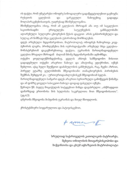 პირველ რიგში, გვსურს, კიდევ ერთხელ გამოვხატოთ ჩვენი დიდი გულისტკივილი რუსეთ-უკრაინის ომის გამო, რასაც სამშობლოს დამცველ ჯარისკაცთა და ათასობით უდანაშაულო ადამიანის სიცოცხლე ეწირება. ჩვენ ეს პროცესები გავიარეთ და კარგად გვესმის იქ არსებული ვითარების სიმძიმე. ზემოთქმულთან ერთად, ვწუხვართ უკრაინის მართლმადიდებელ ეკლესიაში ამჟამად არსებული მდგომარეობის გამოც.