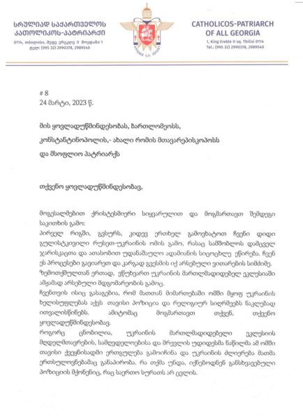 ჩვენთვის ისიც გასაგებია, რომ მათთან მიმართებაში ომში მყოფ უკრაინის ხელისუფლებას აქვს თავისი პოზიცია და რელიგიურ სიღრმეებს ნაკლებად ითვალისწინებს. ამიტომაც მოგმართავთ თქვენ, თქვენო ყოვლადუწმინდესობავ.