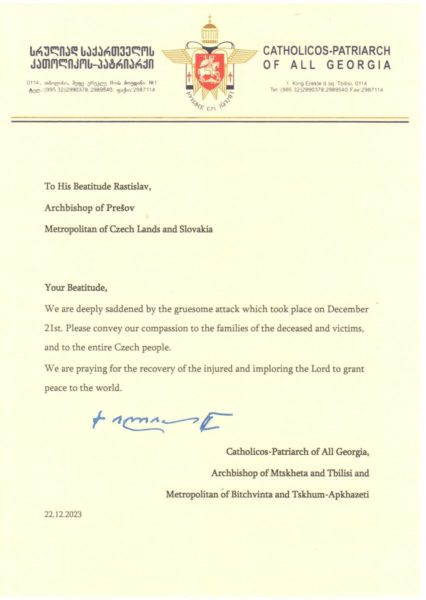 დიდად ვწუხვართ 21 დეკემბერს მომხდარი შემზარავი თავდასხმის გამო. გთხოვთ, გადასცეთ ჩვენი თანაგრძნობა გარდაცვლილთა და დაზარალებულთა ოჯახებს, მთელ ჩეხ ხალხს.
