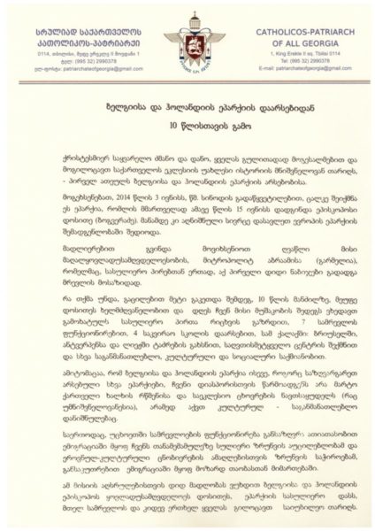 ქრისტესმიერ საყვარელო ძმანო და დანო, ყველას გულითადად მოგესალმებით და მოგილოცავთ საქართველოს ეკლესიის უახლესი ისტორიის მნიშვნელოვან თარიღს, – პირველ ათეულს ბელგიისა და ჰოლანდიის ეპარქიის არსებობისა.
