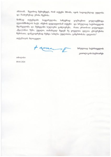 ნიშნად თქვენდამი სიყვარულისა, საჩუქრად გიგზავნით ყოვლადწმიდა ღვთისმშობლის ხატს. ინებოს დედაღვთისამ თქვენი და სრულიად საქართველოს მფარველობა და შემდგომი სულიერი გაძლიერება, რათა ერთობით ვიტყოდეთ: ,,წყალობაი შენი, უფალო, თანამავალ მეყავნ მე ყოველთა დღეთა ცხოვრებისა ჩემისათა, დამკვიდრებად ჩემდა სახლსა უფლისასა, განგრძობასა დღეთასა“