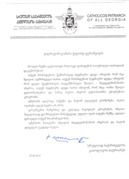 სრულიად საქართველოს კათოლიკოს-პატრიარქის მილოცვა ქ-ნ ლამარა ჭელიძე-ყურაშვილს