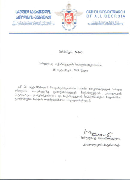 29/10/2019 29/10/2019 საქართველოს საპატრიარქო აქვეყნებს სრულიად საქართველოს კათოლიკოს-პატრიარქის ბრძანებას: ა.წ. 28 ოქტომბრიდან მთავარეპისკოპოსი იაკობი (იაკობიშვილი) პირადი თხოვნის საფუძველზე გათავისუფლდეს საქართველოს კათოლიკოს-პატრიარქის ქორეპისკოპოსის და საქართველოს საპატრიარქოს საფინანსო-ეკონომიკური საბჭოს თავმჯდომარის მოვალეობებიდან. ილია II სრულიად საქართველოს კათოლიკოს-პატრიარქი     karibche.ambebi.ge