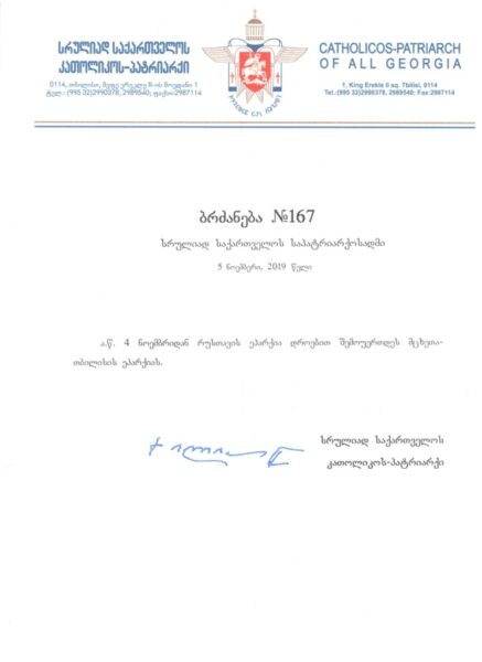 05 Νοεμβρίου, 2019 სრულიად საქართველოს კათოლიკოს-პატრიარქის ბრძანება Διαδώστε: patriarchate.ge Διαδώστε:
