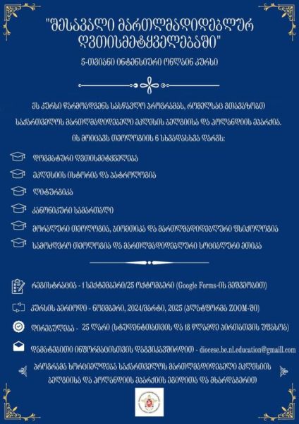 საქართველოს საპატრიარქოს ბელგიისა და ჰოლანდიის ეპარქია იწყებს 5-თვიან ონლაინ ინტენსიურ კურსს “შესავალი მართლმადიდებლურ ღვთისმეტყველებაში”.
