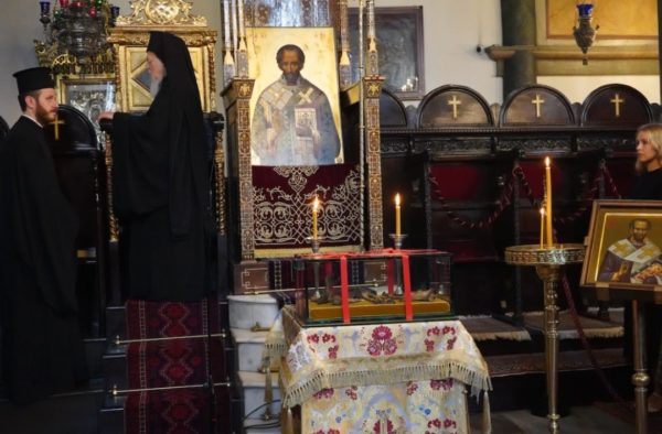 حسب التقليد ، وُضِعَت ايقونة القديس على العرش والى جانبها عصى الرعاية كذلك وضع امام العرش رفات ابينا القديس وتبارك منها المؤمنين