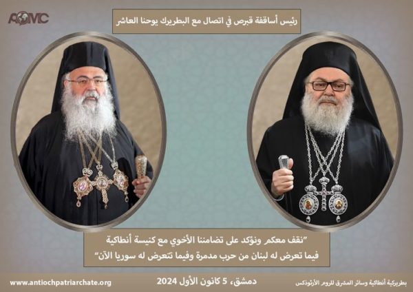 “نقف معكم ونؤكد على تضامننا الأخوي مع كنيسة أنطاكية فيما تعرض له لبنان من حرب مدمرة وفيما تتعرض له سوريا الآن”