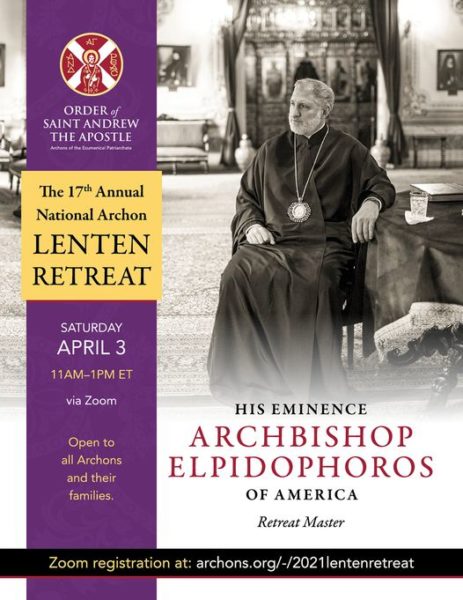 The 17th Annual National Archon Lenten Retreat of the Order of Saint Andrew the Apostle, Archons of the Ecumenical Patriarchate is open to all Archons and their families. This year the retreat promises to be particularly inspiring, as the retreat master will be His Eminence Archbishop Elpidophoros of America. The retreat will occur on April 3rd, 2021, from 11AM-1PM EST.