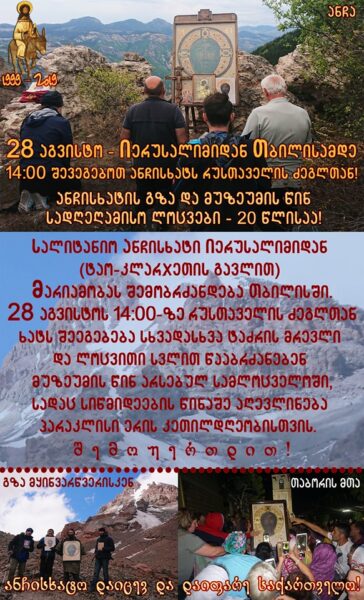 26/08/2019 26/08/2019 1999-2019 – ანჩისხატის გზა და მუზეუმის წინ სადღეღამისო ლოცვები 20 წლისაა. 28 აგვისტოს – მარიამობას,14:00 სთ-ზე სალიტანიო ანჩისხატი თბილისში, რუსთაველის ძეგლთან შემობრძანდება, სადაც ხატს შეეგებებიან მორწმუნეები და ლოცვითი სვლით წააბრძანებენ მუზეუმის წინ არსებულ სამლოცველოში. სიწმიდეების წინაშე აღევლინება პარაკლისი ერის კეთილდღეობისთვის. შ ე მ ო უ ე რ თ დ ი თ ! 29 აგვისტოს –...