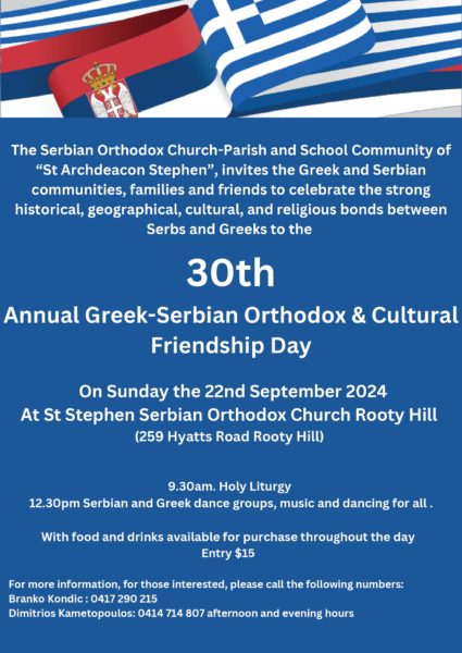 The Serbian Orthodox Parish of Saint Stephen the Archdeacon in Sydney and its School Community warmly invite Greek and Serbian communities, along with their families and friends, to join in celebrating the deep historical, geographical, cultural, and religious bonds between Serbs and Greeks.