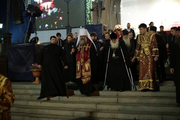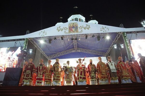 The Divine Liturgy was celebrated on the square in front of the Church of All Saints of Russia (the Church on the Blood) by His Eminence Metropolitan Vikenty of Tashkent and Uzbekistan, His Eminence Metropolitan Kirill of Ekaterinburg and Verkhoturye, His Eminence Metropolitan Gregory of Chelyabinsk and Miass, His Grace Bishop Innocent of Magnitorsk and Verkhneuralsk, His Grace Bishop Methodios of Kamensk and Kamishlov, His Grace Bishop Vladimir or Shadrinsk and Dalmatovo, His Grace Bishop Eugene of Nizhny Tagil and Nevyansk, His Grace Bishop Vikenty of Zlatoust and Satka, His Grace Bishop Alexei of Serov and Krasnoturinsk, and His Grace Bishop Leonid of Alapaevsk and Irbit.