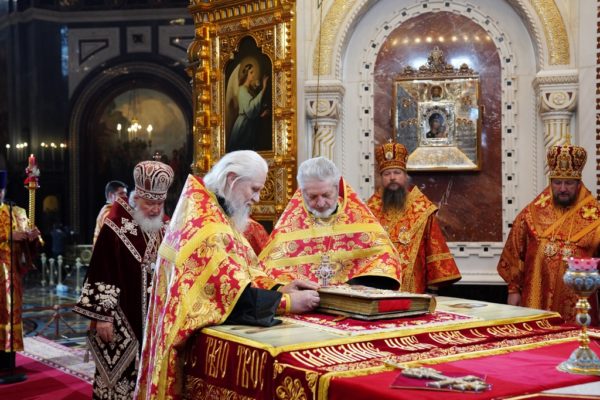 Его Святейшеству сослужили: митрополит Крутицкий и Коломенский Павел, Патриарший наместник Московской митрополии; митрополит Воскресенский Дионисий, управляющий делами Московской Патриархии, первый викарий Патриарха Московского и всея Руси по г. Москве; митрополит Каширский Феогност, председатель Синодального отдела по монастырям и монашеству; архиепископ Егорьевский Матфей; архиепископ Подольский и Люберецкий Аксий, секретарь Архиерейского совета Московской митрополии; епископ Павлово-Посадский Силуан, заместитель управляющего делами Московской Патриархии; епископ Сурожский Матфей; епископ Одинцовский и Красногорский Фома, руководитель Административного секретариата Московской Патриархии; епископ Сергиево-Посадский и Дмитровский Фома, наместник Свято-Троицкой Сергиевой лавры; епископ Зеленоградский Савва, заместитель управляющего делами Московской Патриархии; протопресвитер Владимир Диваков, секретарь Патриарха Московского и всея Руси по г. Москве; протоиерей Михаил Рязанцев, ключарь Храма Христа Спасителя; протоиерей Николай Балашов, заместитель председателя Отдела внешних церковных связей Московского Патриархата; архимандрит Алексий (Туриков), личный секретарь Святейшего Патриарха Кирилла; протоиерей Игорь Якимчук, секретарь ОВЦС по межправославным отношениям; иерей Дионисий Казанцев, секретарь Святейшего Патриарха по Московской митрополии; иеромонах Ермоген (Бурыгин), и.о. председателя Финансово-хозяйственного управления Московского Патриархата; московское духовенство.