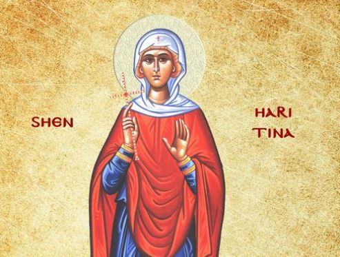 Por Haritina e fortë në sigurinë ngazëlluese të apostujve të Zotit, e ngushëlloi me këto fjalë: “Zotëria im, gëzohu dhe mos u hidhëro, sepse do të ofrohem si një therore e pëlqyer për Perëndinë për mëkatet e mia dhe të tuat”. Ai iu përgjigj: “Shërbëtore e Perëndisë, kujtohu për mua në Mbretërinë e qiejve”, pastaj e dërgoi te konti. E nxorën para gjykatësit, por vajza rrëfeu me guxim Krishtin.