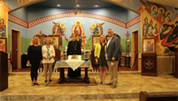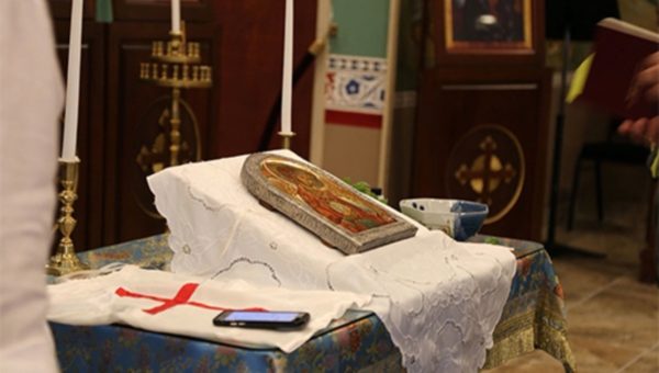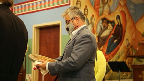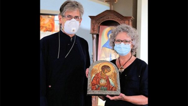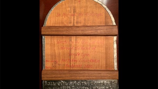 Nikos Linardakis, accompanied by the iconographer, Veryle Lynn Cox, and a few others, attended the ceremony of this icon’s blessing at Saint Philothea’s Greek Orthodox Church in Watkinsville, Georgia. As is customary of icons, it was first held by the church for forty days. Father Anthony Salzman of Saint Philothea spoke of the icon and its blessing.