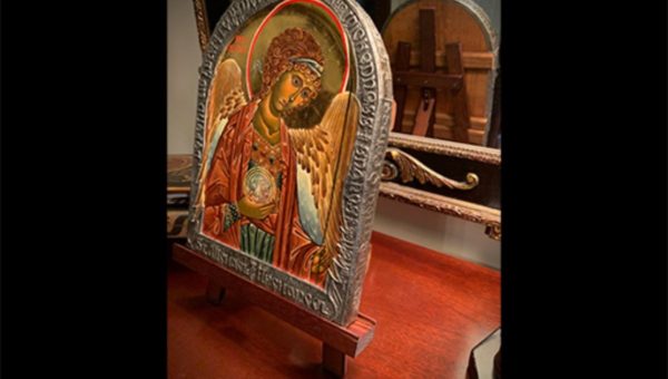 This icon of Saint Michael the Archangel, created for Dr. Linardakis, was inspired by the original, 14th century icon first-inspired through Andrei Rublev. Unique to this icon is its oklad, or metal frame, placed along the icon’s border, transcribed with the words of an old, Catholic prayer. Mrs. Cox, and other iconographers, use the technique of repoussé, or “re-pushing,” to raise words and prayers across the soft, metal exteriors of icons. Father Daniel Armatas, a friend of Dr. Linardakis, assisted with the prayer’s choosing. Such icons deliver peace, explained Father Armatas, as he cited Saint Seraphim of Sarov: “Acquire the Spirit of Peace, and a thousand souls around you will be saved.”