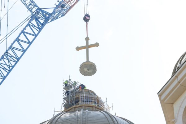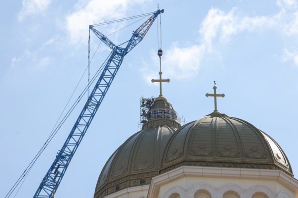 O cruce de 7 tone a fost montată marți pe turla mare a Catedralei Naționale, la aproximativ 130 de metri înălțime. „Momentul de top din punct de vedere ingineresc a fost sublimat de slujba de sfințire oficiată de PS Varlaam Ploieșteanul”, a spus Pr. Nicolae Crîngaşu, Consilier patriarhal coordonator la Sectorul Monumente şi construcţii bisericesti al Patriarhiei Române.
