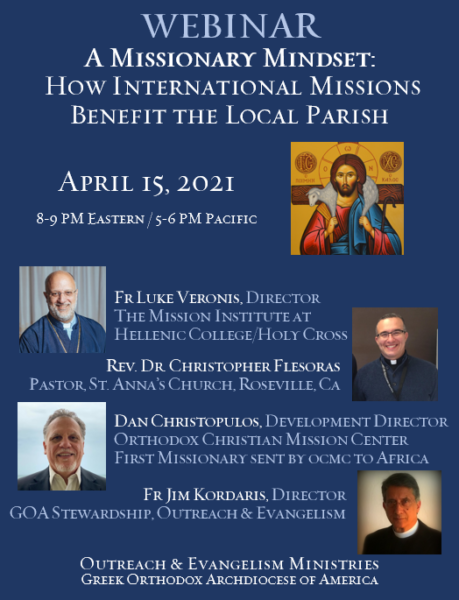 Our presenters will share their personal experiences in various areas of missions as they relate to parish life. Fr Luke Veronis served as a long-term missionary to East Africa and then Albania under the leadership of Archbishop Anastasios Yannoulatos. Fr. Luke now serves as Director of the Mission Institute at Hellenic College/Holy Cross and pastor of Saints Constantine & Helen Church in Webster, MA. Rev. Dr. Christopher Flesoras has served the parish of Saint Anna in Roseville, CA since 2001. Since that time, the parish has sent two parishioners as long-term missionaries to Africa and Guatemala, and funded construction of the Church of Saint Anna, Mount Kenya and funds its long-term operation. Dan Christopulos participated in parish ministry for 15 years, spending almost 3 years in the mission field in East Africa, as the first missionary priest sent overseas by the Greek Orthodox Mission Center (now OCMC). Thirty-five years later, Dan has returned to OCMC to help engage others in the critical work of financially supporting the efforts of the Mission Center to make disciples of all nations by bringing people to Christ and His Church. Fr Jim Kordaris has served as Director of Outreach & Evangelism of the Greek Orthodox Archdiocese since its formation in 2003. All presenters are graduates of Holy Cross Greek Orthodox School of Theology in Brookline, MA.