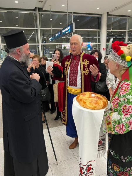 At the Sydney Kingsford Smith Domestic Airport, Ukranian faithful lead by Father Savvas Pizannias, Proistamenos of the Ukranian Parish of Saint Savva of Kalymnos in Sydney, alongwith Mr Peter Deriashnyj, President of the Federation of Ukrainian Cossacks of Australia and President of the Ukrainian Parish of St. Basil in Newcastle; awaited the Archbishop upon his arrival, to express their gratitude to him for accepting them under his Omophorion and his spiritual protection.
